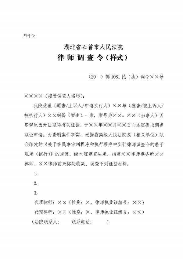 石首市人民法院关于在民事审判程序和执行程序中实行律师调查令的若干规定(试行)