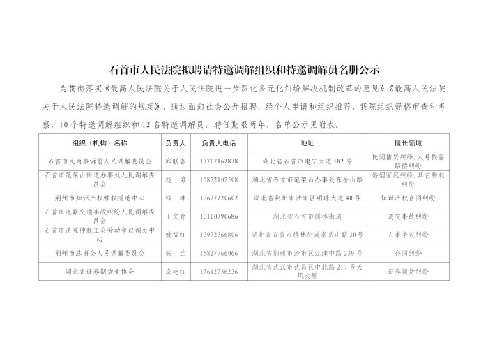 石首市人民法院拟聘请特邀调解组织和特邀调解员名册公示